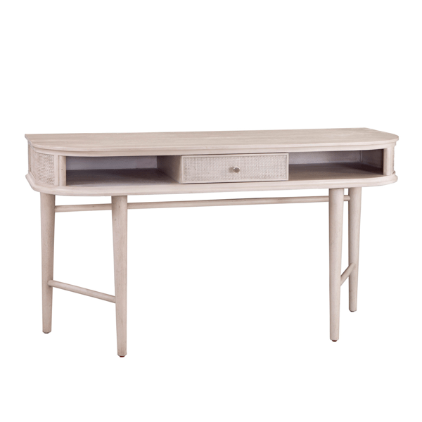 The Brandi Desk is a modern Boho / Coastal inspired design with clean lines and a white-washed finish on mindi veneers and box-weave door fronts. Brushed nickel knob add a touch of glam sophistication. Round, tapered legs are Scandinavian influence and wrap-around cane detailing. This desk features one drawer and two open compartments for storage.