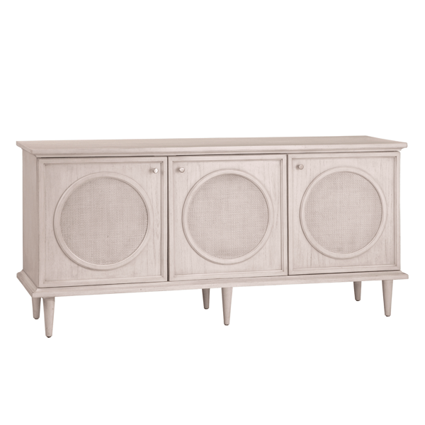 The Brandi Server is a modern Boho / Coastal inspired design with clean lines and a white-washed finish on mindi veneers and box-weave door fronts. Brushed nickel knobs add a touch of glam sophistication while round, tapered legs are Scandinavian in influence and there are three doors and adjustable shelves as well as BMC standard media cord management.