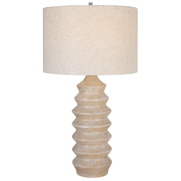 Carved with a ribbed design, this shapely wooden lamp is finished with a bleached wood tone that shows off the inherent beauty of the wood’s grain. A oatmeal linen slubbed drum shade completes the look.