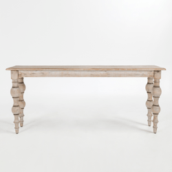 Bring elegance to your home with this beautiful console table. Hand turned legs add sculptural design elements that, along with the distressed finish add to its lived-in, rustic charm. It's antique white-washed look and natural tones make this table the perfect new addition to any home.