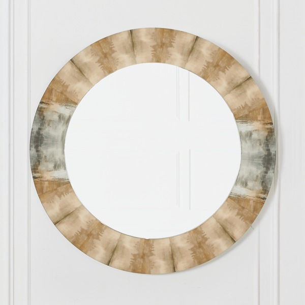Inspired by cloudscape paintings, this mirror’s round frame is finished with a soft wash of color in gradients of taupe and blue, making it a brilliant, neutral accent for any wall.
