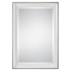 Indulge your wall with the contemporary cosmopolitan style of our Commencement Mirror. With a sloped wooden frame and glossy white finish, our mirror’s beautifully beveled border produces a glowing reflection. Silver leaf embellishment around the frame gives Commencement a glamorous edge.