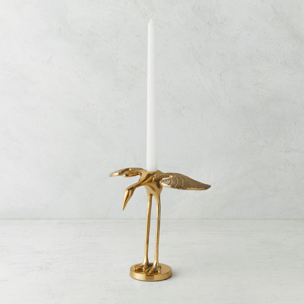 A graceful and elegant addition to any mantel, shelf, or tabletop. These crane taper holders are intricately detailed and finished in gold. Each holds one taper candle (candle not included).