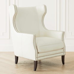 Double rows of hand-applied nailhead trim accentuate the curvy silhouette of our Davis accent chair. Designed with a modern wingback frame and upholstered in supple leather, its generous proportions, rounded back, and removeable lumbar pillow ensure this piece is as comfortable as it is stylish. Shown in Cortina White Leather.