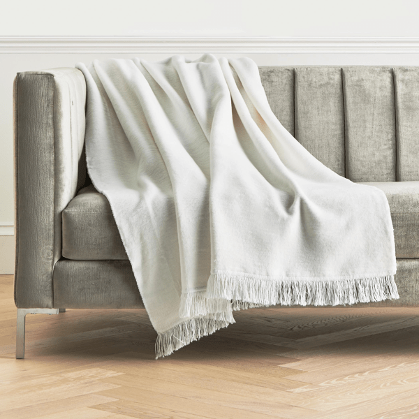 Our Della throw is a cozy classic, the perfect gift or go-to for any nook. Long enough to keep toes covered, it's woven in a luxe Cotton/Acrylic blend and thoughtfully finished with softly fringed edges.