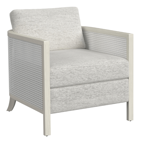 The Korey accent chair features a coastal farmhouse inspired design with a solid wood chair frame with double-layered open cane that wraps around the entire silhouette. The wood frame and caning that are hand-brushed and padded for a lightly distressed feel.