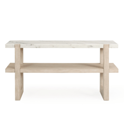 The Lido collection exudes Coastal Modernism, defined by the fresh, airy finish and white marble. Ash veneer in a sun-bleached finish is applied over thick, tapered legs that are exposed through the tops of the marble tabletops.