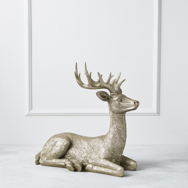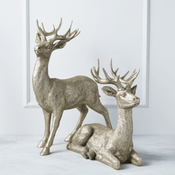 Textured layers of champagne animate the elegant poses of our deer figures as they gracefully rest anywhere in your home. The large scale of these deer brings out the intricate detailing that touches the antlers’ graceful curvature.