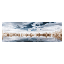 Grandiose in size, the tranquil setting of a lake reflecting its surroundings of tonal hued trees and a cloud covered sky, offer viewers a slice of serenity in our piece titled Mirrored. Layered with depth and tone on tone hues of blues juxtaposed against creams and whites, Mirrored brings a sense of calmness to a space. Gallery wrapped for modern appeal, Mirrored makes the perfect complement to a wider variety of décor settings.