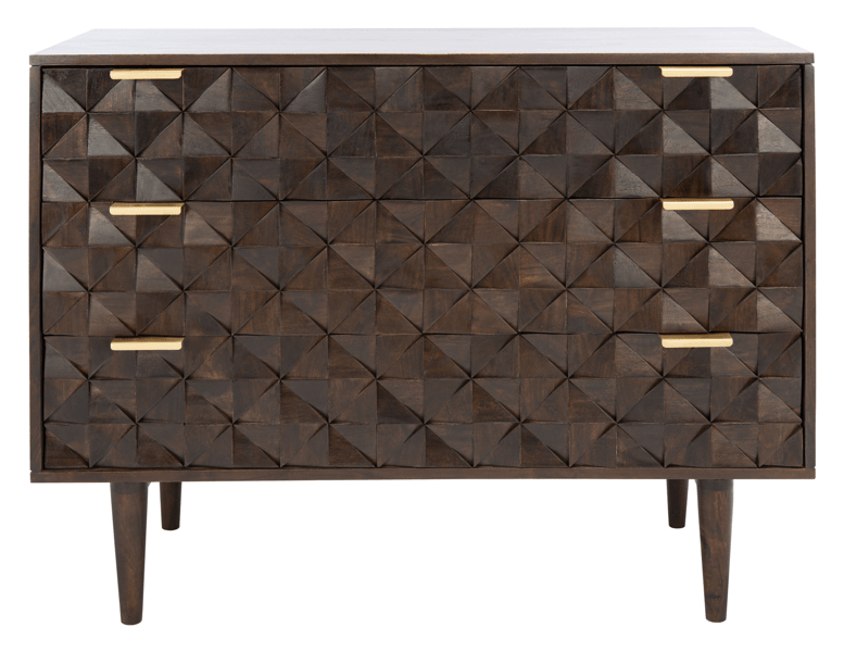 The finely carved geometric details of this Nala Chest give it a distinct couturier look, elevating your décor to new heights of style. Nala’s three ample drawers feature artfully faceted accents beautifully highlighted by a deep walnut finish, making it perfect for any color scheme.