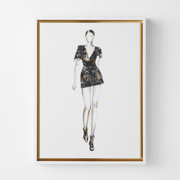 Small-scale in stature, but big on style, the On The Runway Series makes a fashion statement for sure. Each piece is created using giclee on canvas with a hand-applied image brush gel finish. They are framed in white floater frames with gold inner framing. On The Runway XI is #2 of 4 in a series.