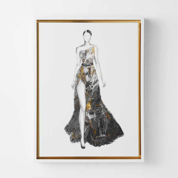 Small-scale in stature, but big on style, the On The Runway Series makes a fashion statement for sure. Each piece is created using giclee on canvas with a hand-applied image brush gel finish. They are framed in white floater frames with gold inner framing. On The Runway XII is #3 of 4 in a series.