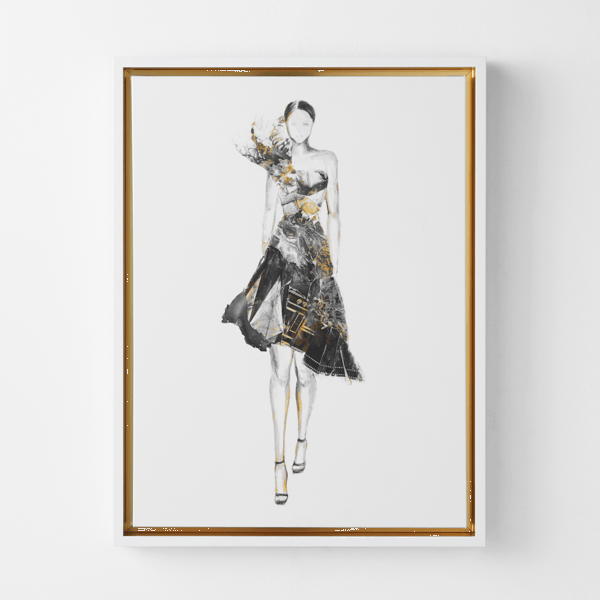 Small-scale in stature, but big on style, the On The Runway Series makes a fashion statement for sure. Each piece is created using giclee on canvas with a hand-applied image brush gel finish. They are framed in white floater frames with gold inner framing. On The Runway XIII is #4 of 4 in a series.