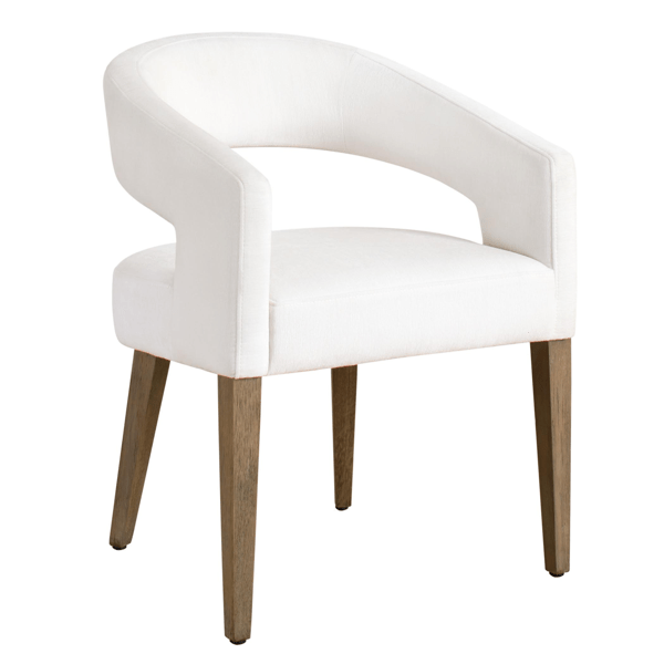 A curved silhouette, neatly tailored upholstery, and sleek back cutout make this eye-catching dining chair a standout piece. Shown in Kenley Chenille Snow.
