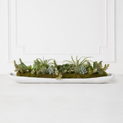 The premade arrangement of faux succulents in a long white wood bowl is a visually stunning and modern centerpiece that brings nature's beauty into any space. The bowl, crafted from sleek white wood, adds a touch of elegance and simplicity to the arrangement.