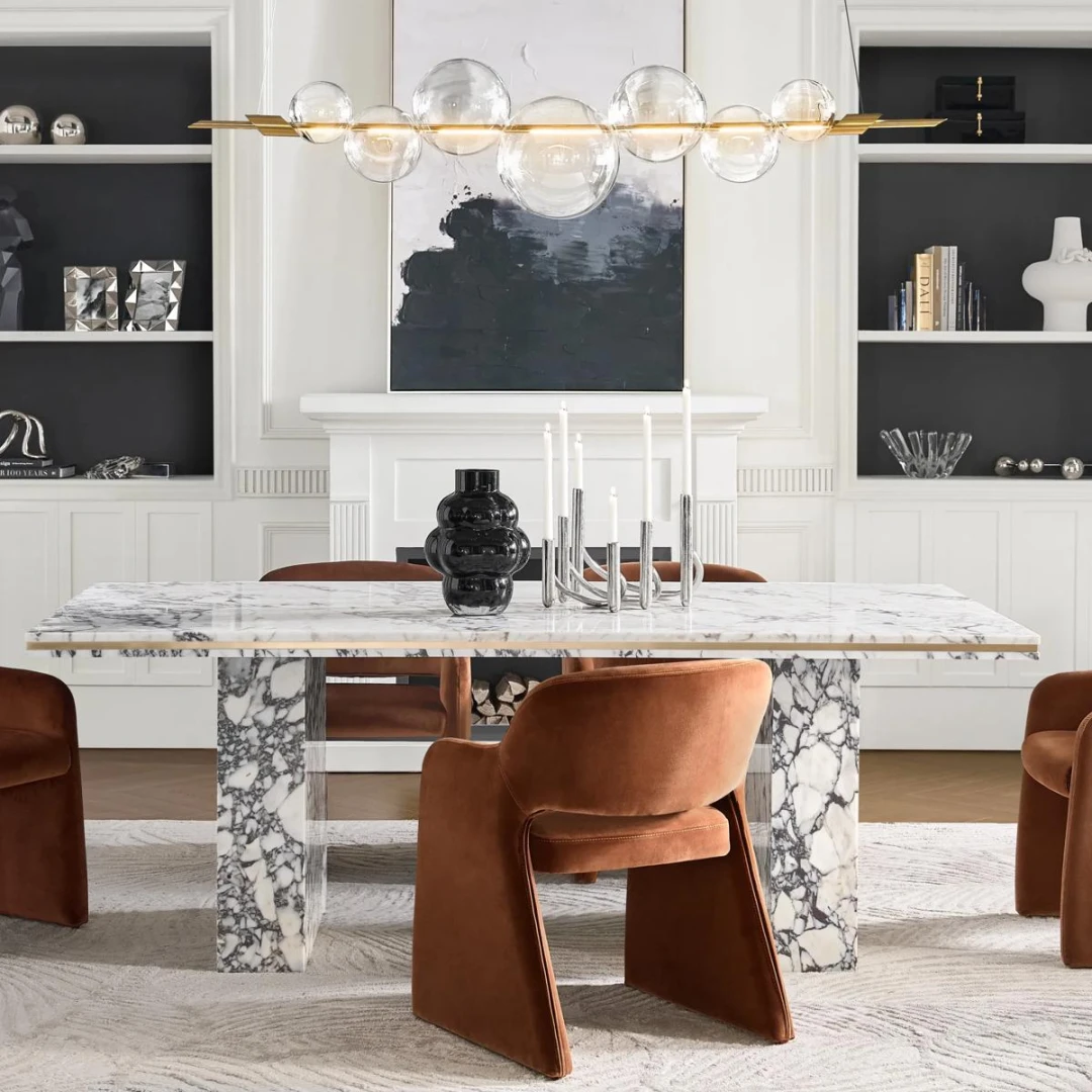 Spec: Marble/glass dining table + 6 velvet dining chairs + pendant lighting