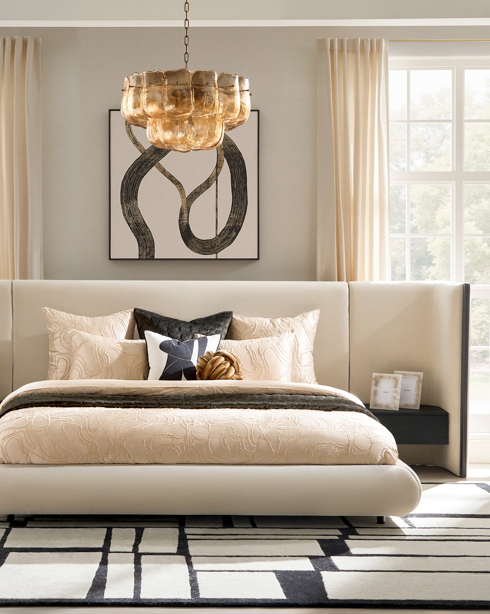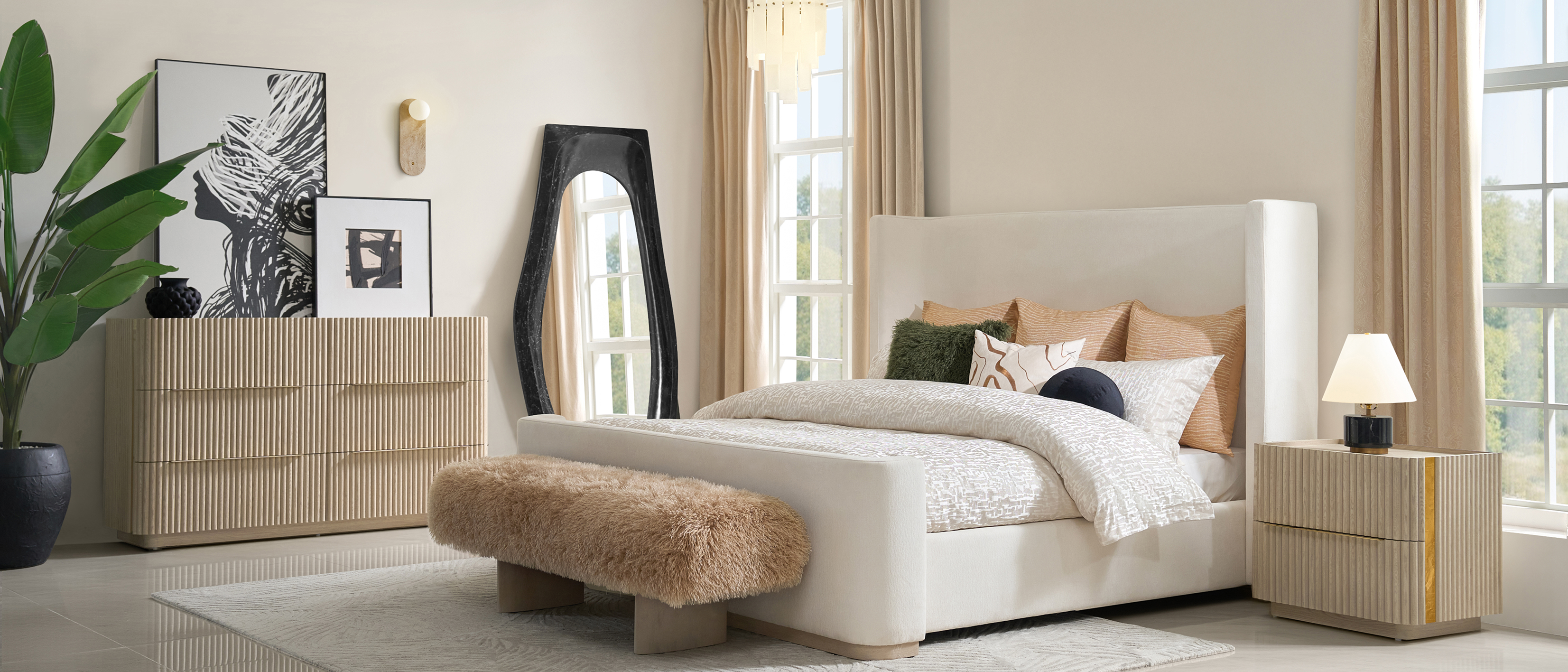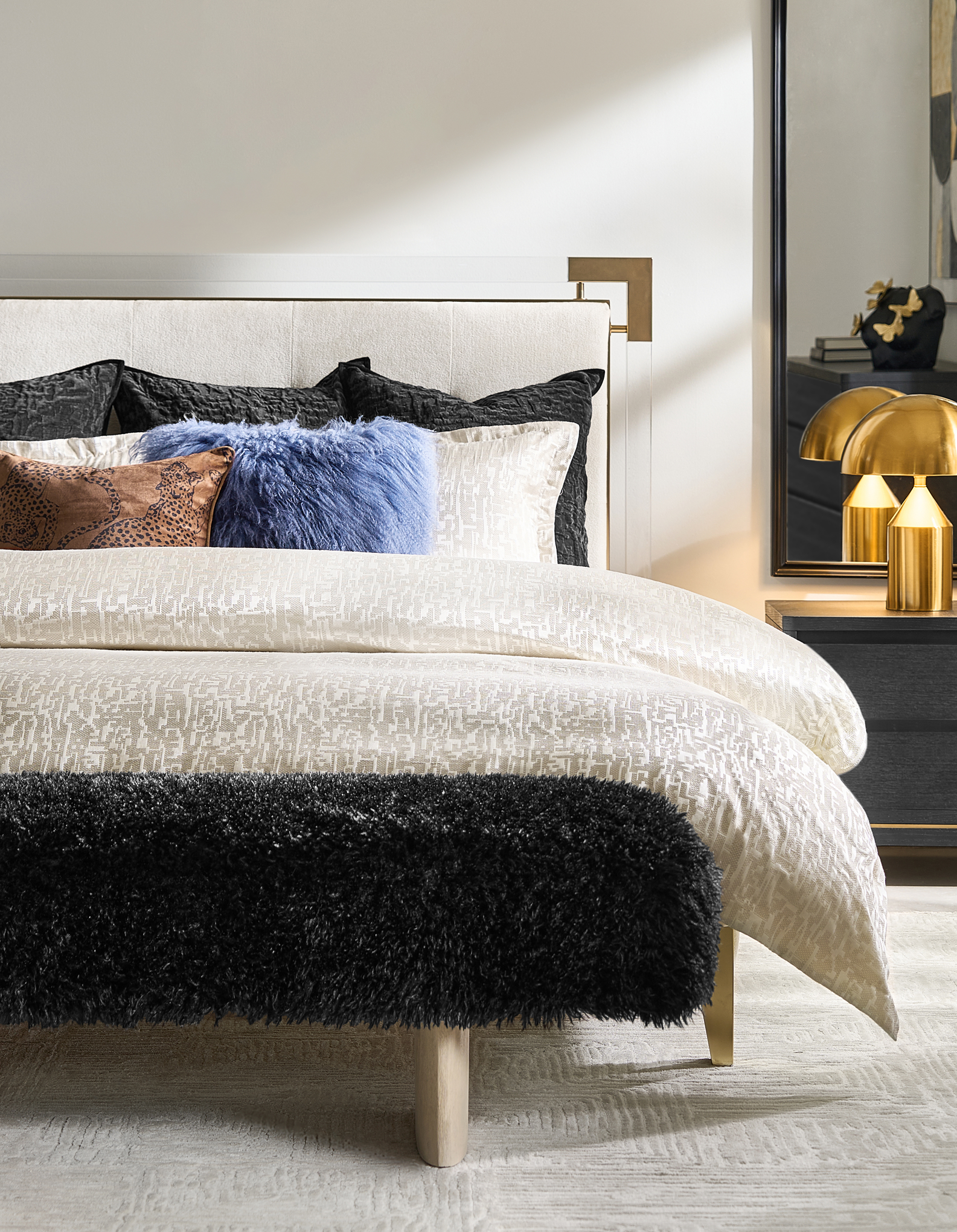 Frame your bed with modern nightstands, luxury table lamps, or statement wall sconces. Add texture with plush bedding, a decorative throw, and accent pillows in coordinating colors. Anchor the look with a designer area rug and complete the space with elegant wall décor or a full-length mirror.