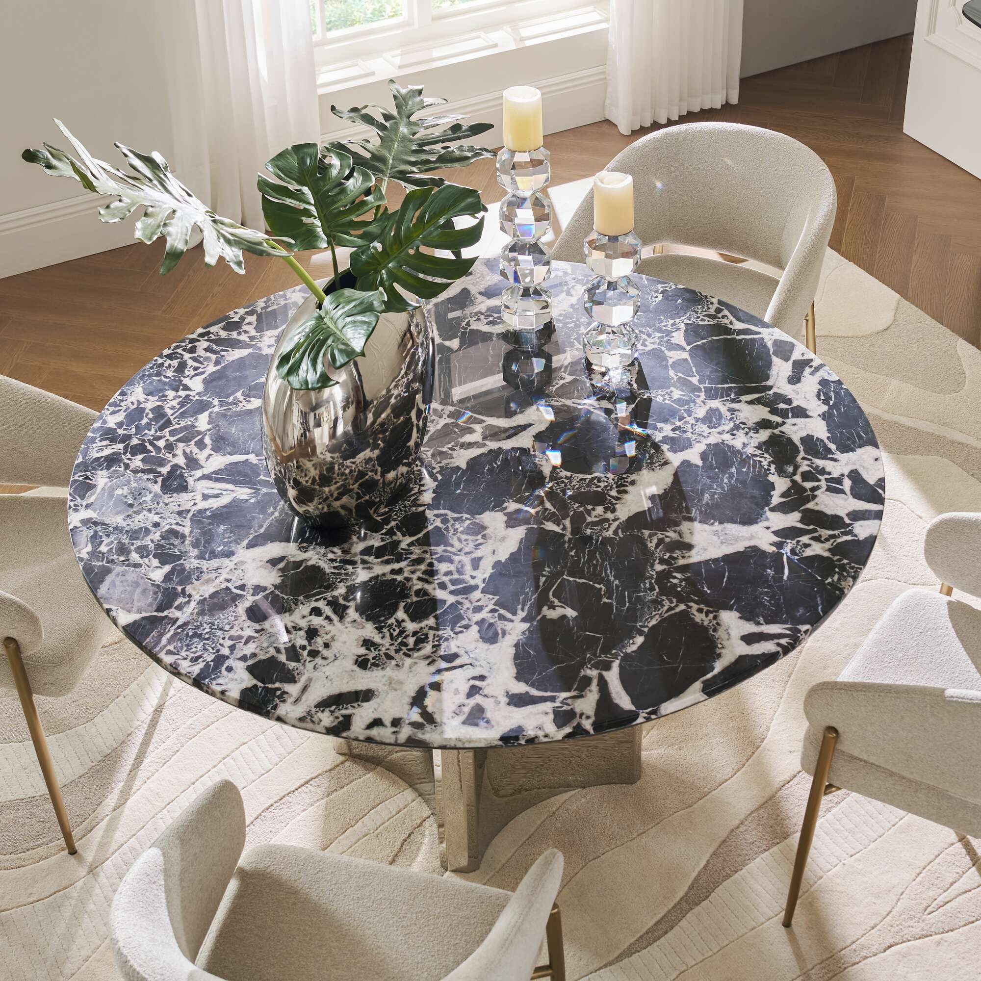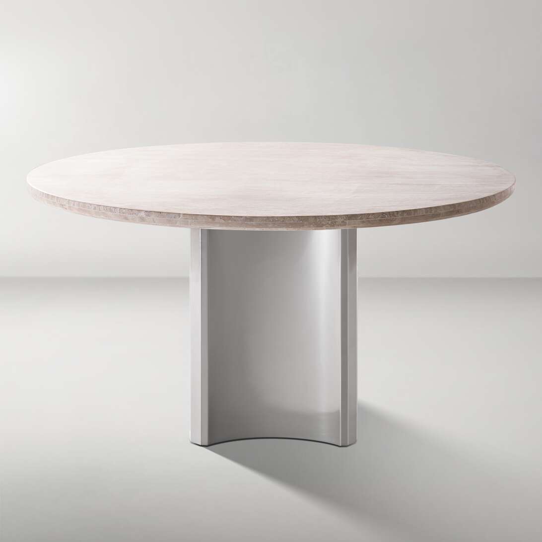 Featuring a round table top in a polished stainless steel base, the Ventane collection is a harmonious blend of natural charm and modern sophistication.