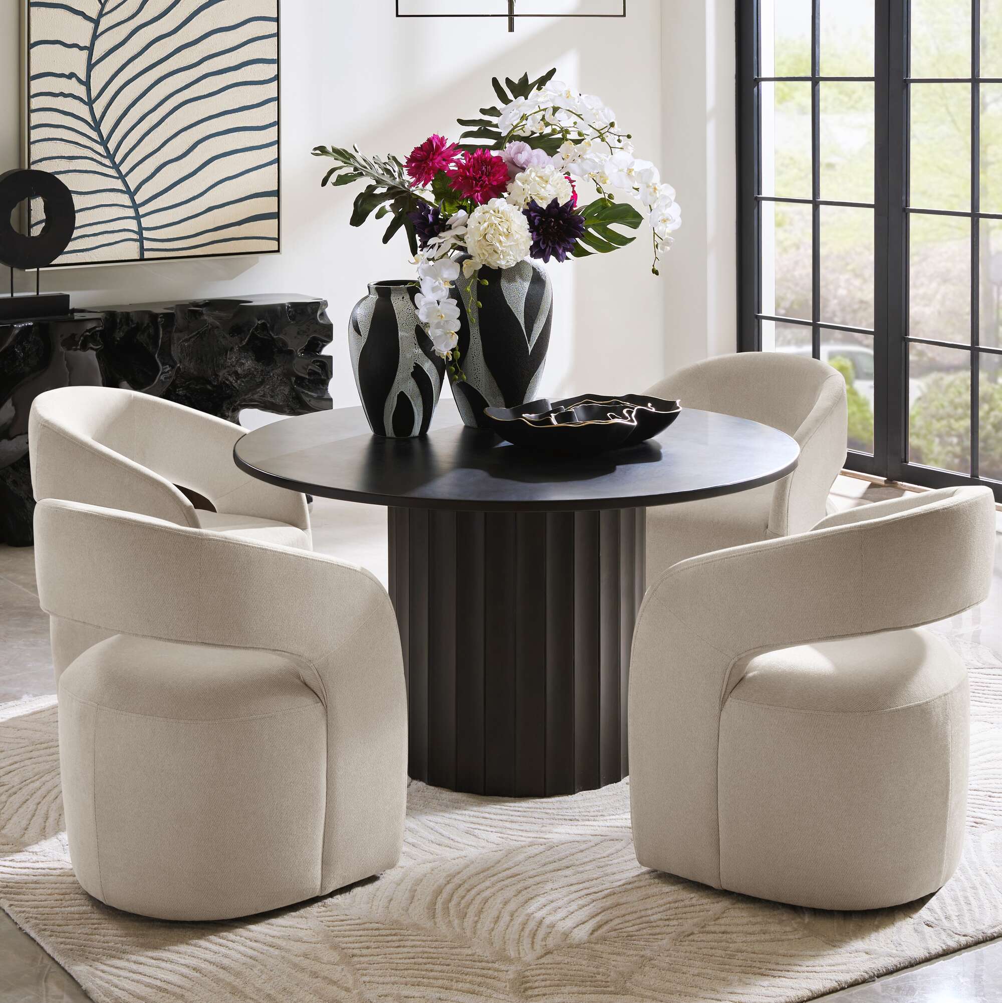 Modern and refined with a hand-rubbed ebony finish, the Dahlia collection’s round top is anchored by a fluted pedestal base with ribbed molding.