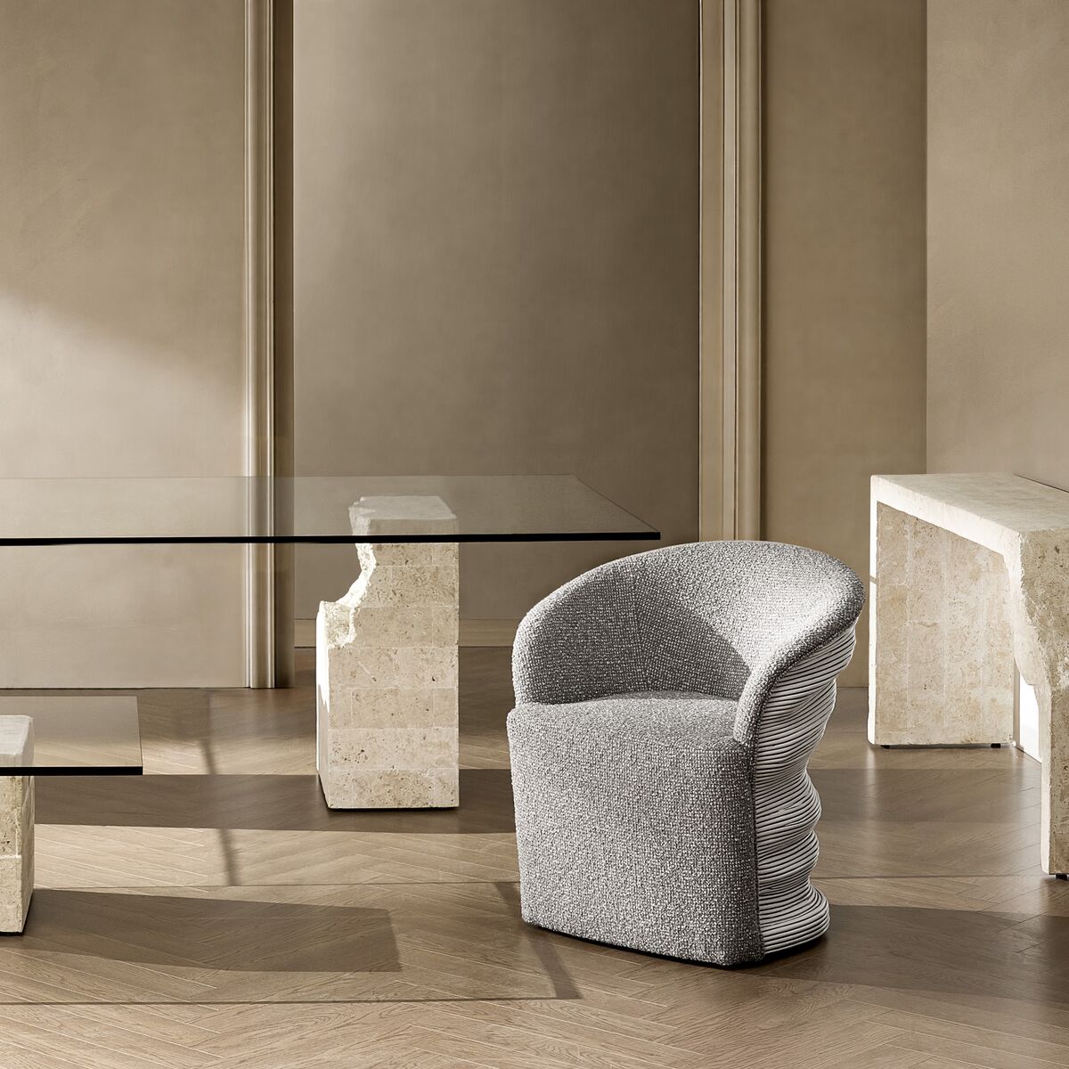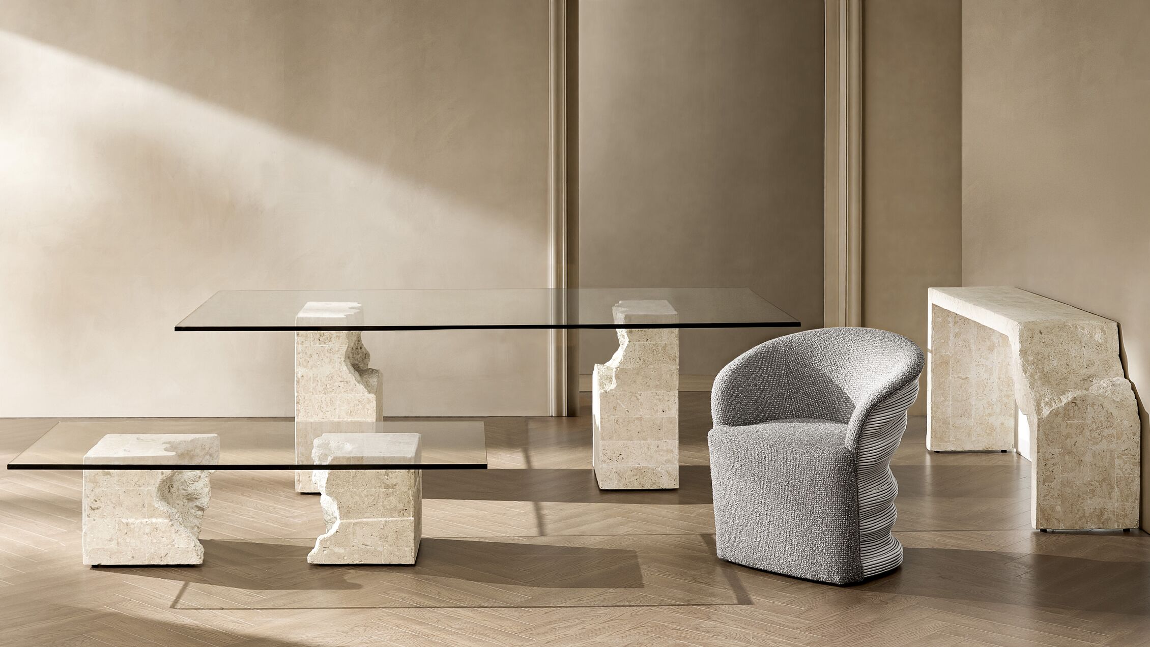 The Cairo Collection holds an architectural dialogue between stone and glass-grounded in raw materiality yet elevated by contemporary minimalism.