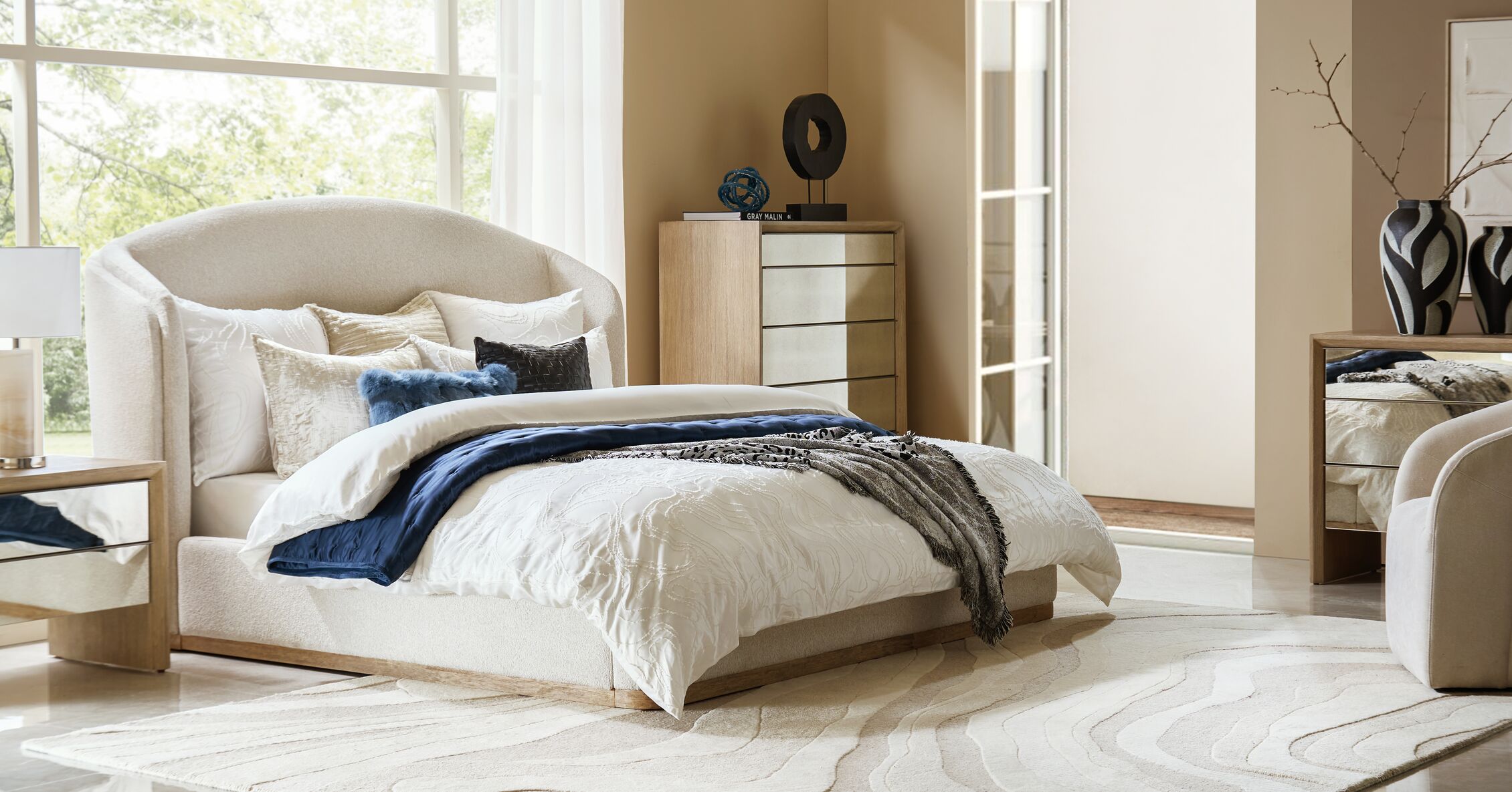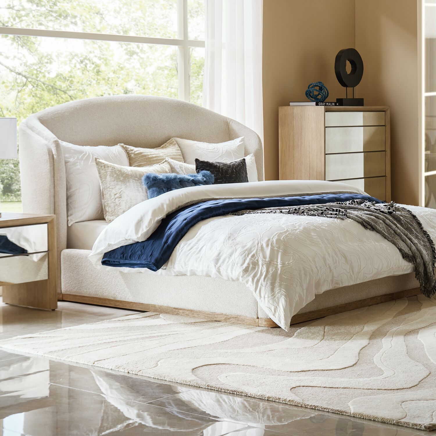 Transform your bedroom into a sanctuary with the Glimmer Bedroom sets. This set features a gracefully curved headboard with hand-crafted double-layered detailing while the antique mirror-faced design introduces a soft, reflective glow. The Glimmer Bedroom Set is the epitome of relaxation and refined style.