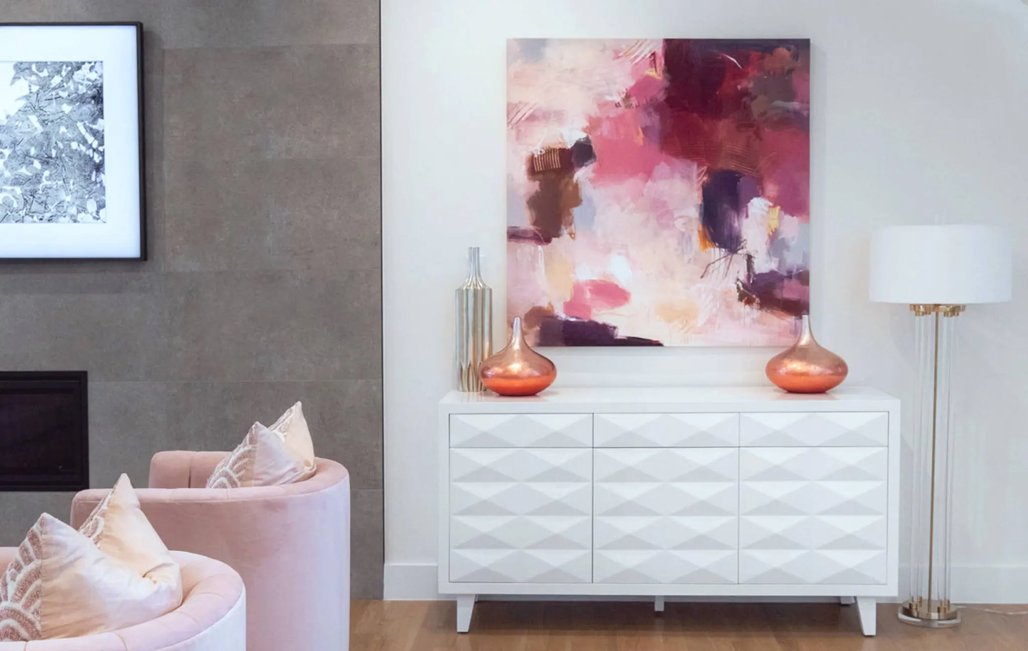 Shades of blush and textual pillows add just the right amount of playful to the room.