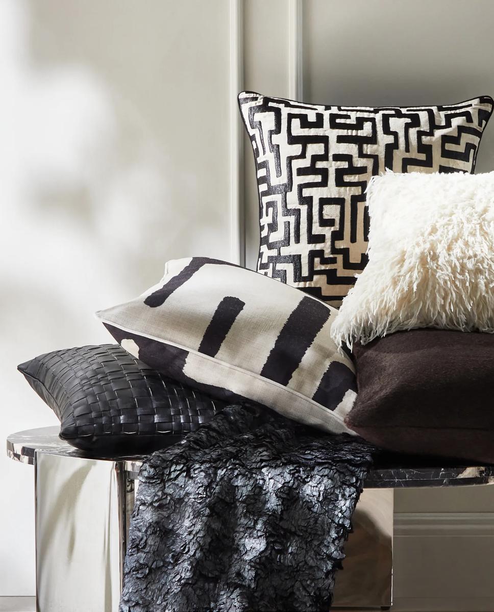 Eren Fringe Throw 50" x 60"$99A woven black and ivory throw featuring a bold swirl pattern, textured softness, and fringed edges.