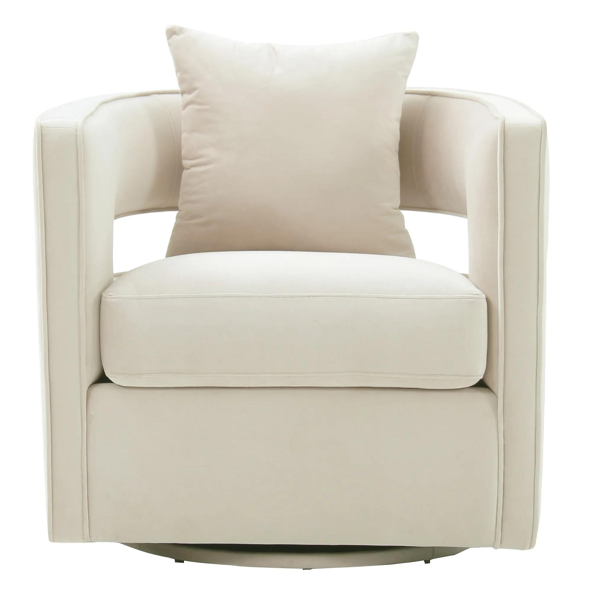 Lottie Swivel Chair$999A glamorous cream velvet swivel chair featuring a barrel back, cutout arms, and plush foam cushioning.