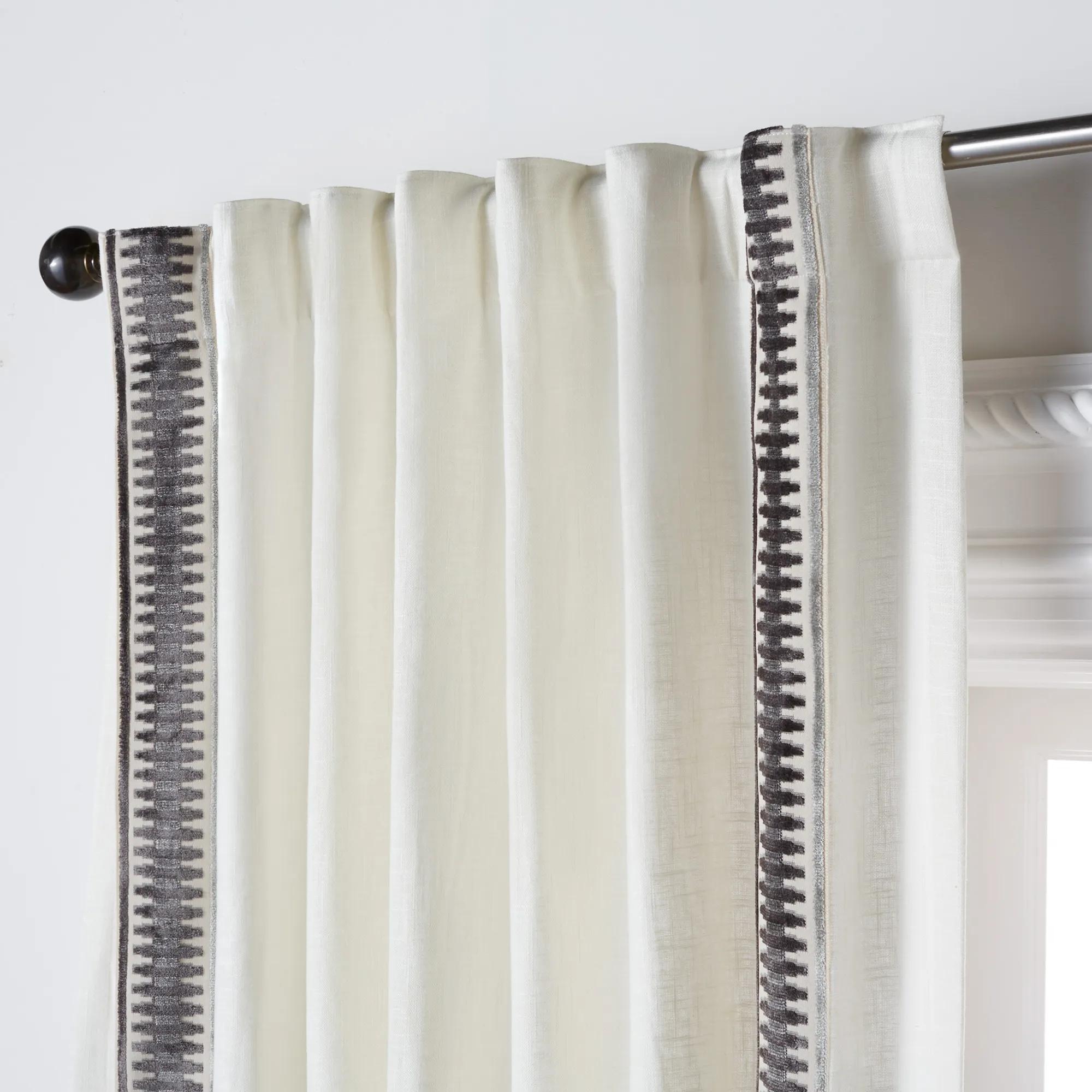 Chloe Velvet Geometric Curtain - Custom$269A customizable white linen-blend curtain panel with grey velvet geometric border and multiple hanging options.
