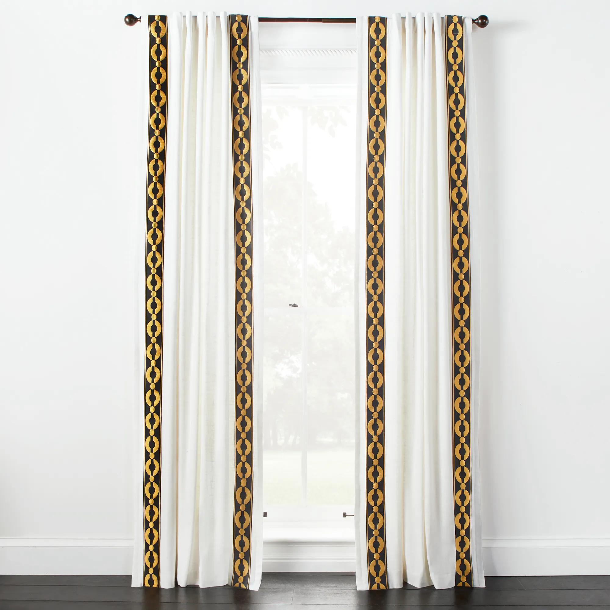 Chloe Velvet Greek Key Curtain - Custom$339A white linen-blend curtain featuring a black and gold embroidered velvet Greek key border for elegant style.