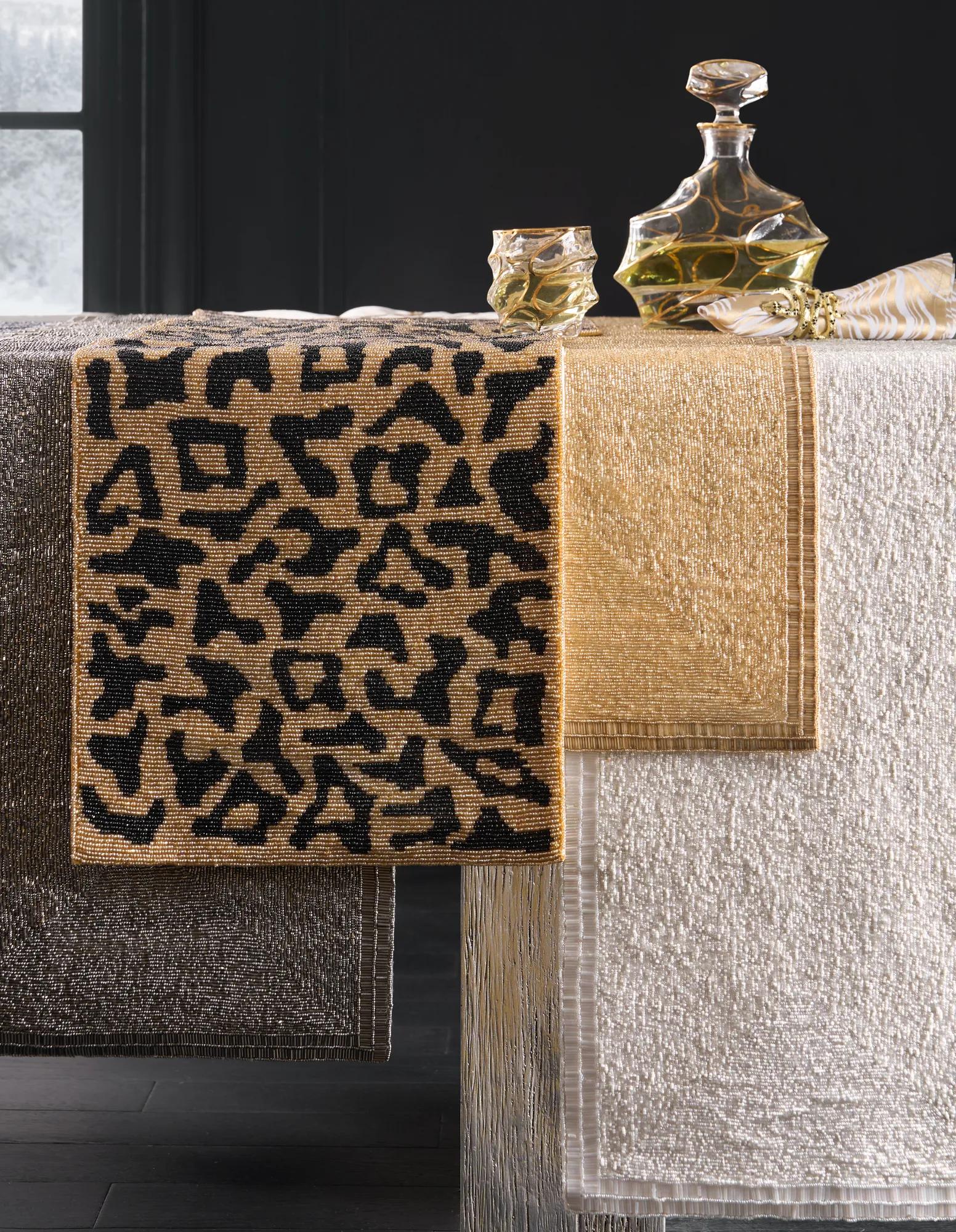 Leo Beaded Runner$99A hand-beaded table runner featuring a striking black and gold leopard print on glass beads.