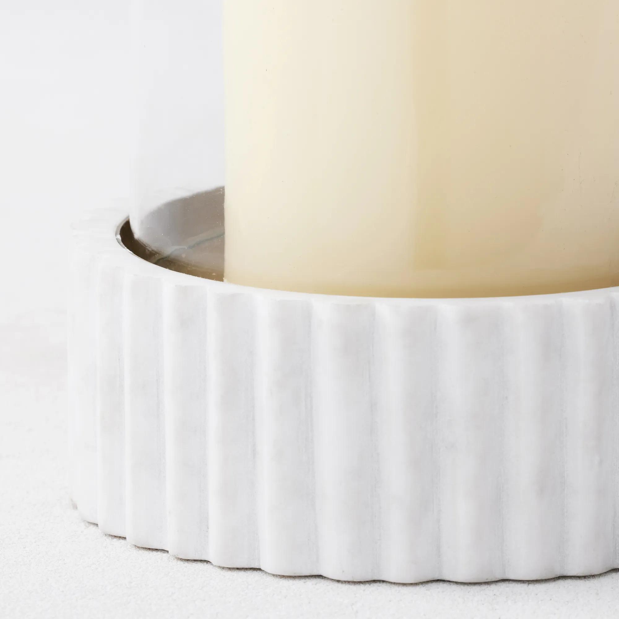 Marbella Hurricane$129A hurricane candle holder featuring a carved white marble base and a gilded bottom for elegant illumination.