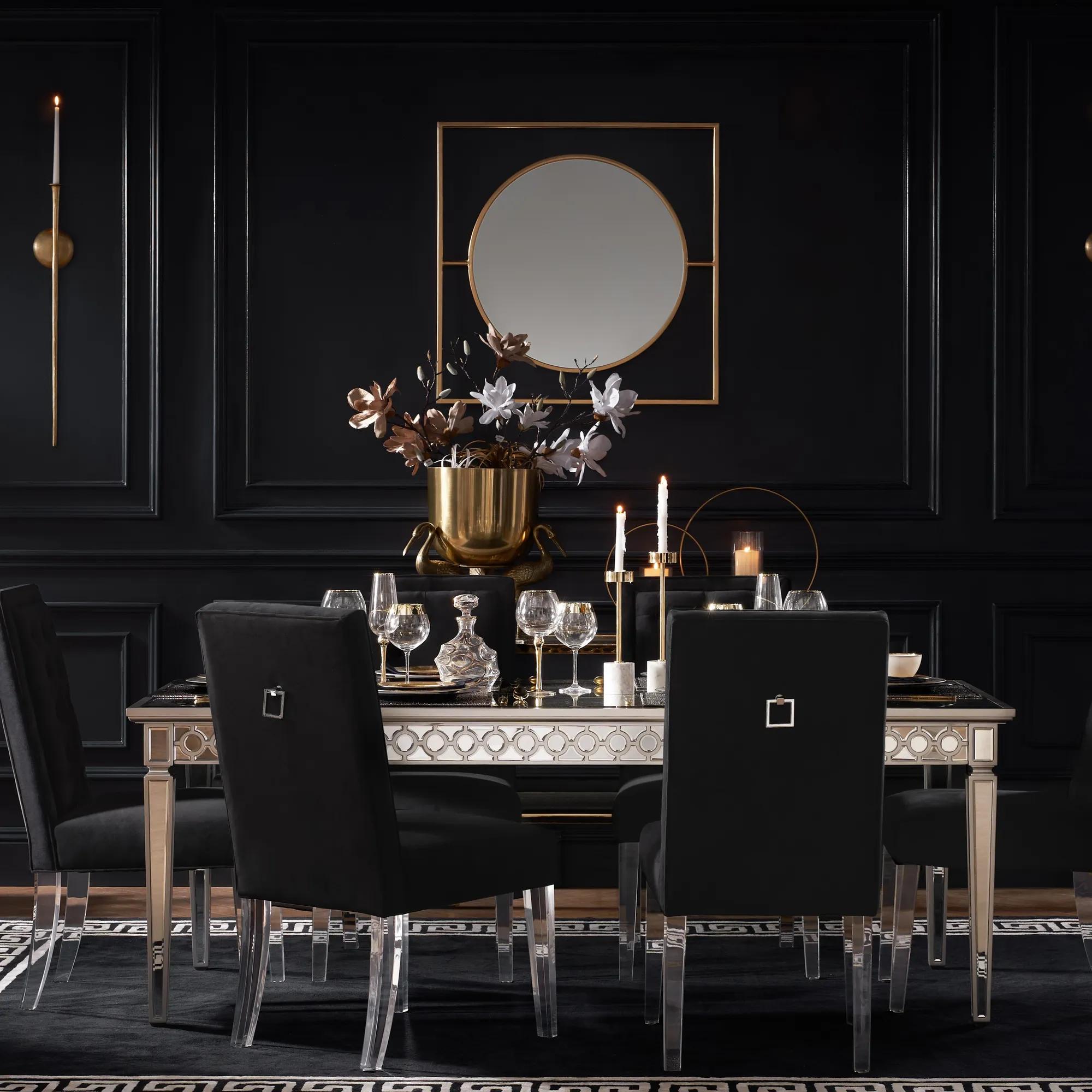 To create a showstopping dining experience, use tufted chairs with acrylic legs at the head and foot of your table, or surround the entire table for a cohesive, dramatic look. The transparency of the legs keeps the space feeling open and airy, while the tufted upholstery adds richness and comfort. Pair them with a statement chandelier or bold centerpiece to amplify the sense of luxury and artistry.