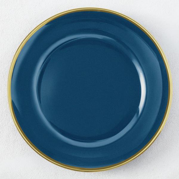Cosmo Dinnerware Sets - Sapphire$76A set of shimmering sapphire glass dinnerware with elegant gold rims for a modern table setting.