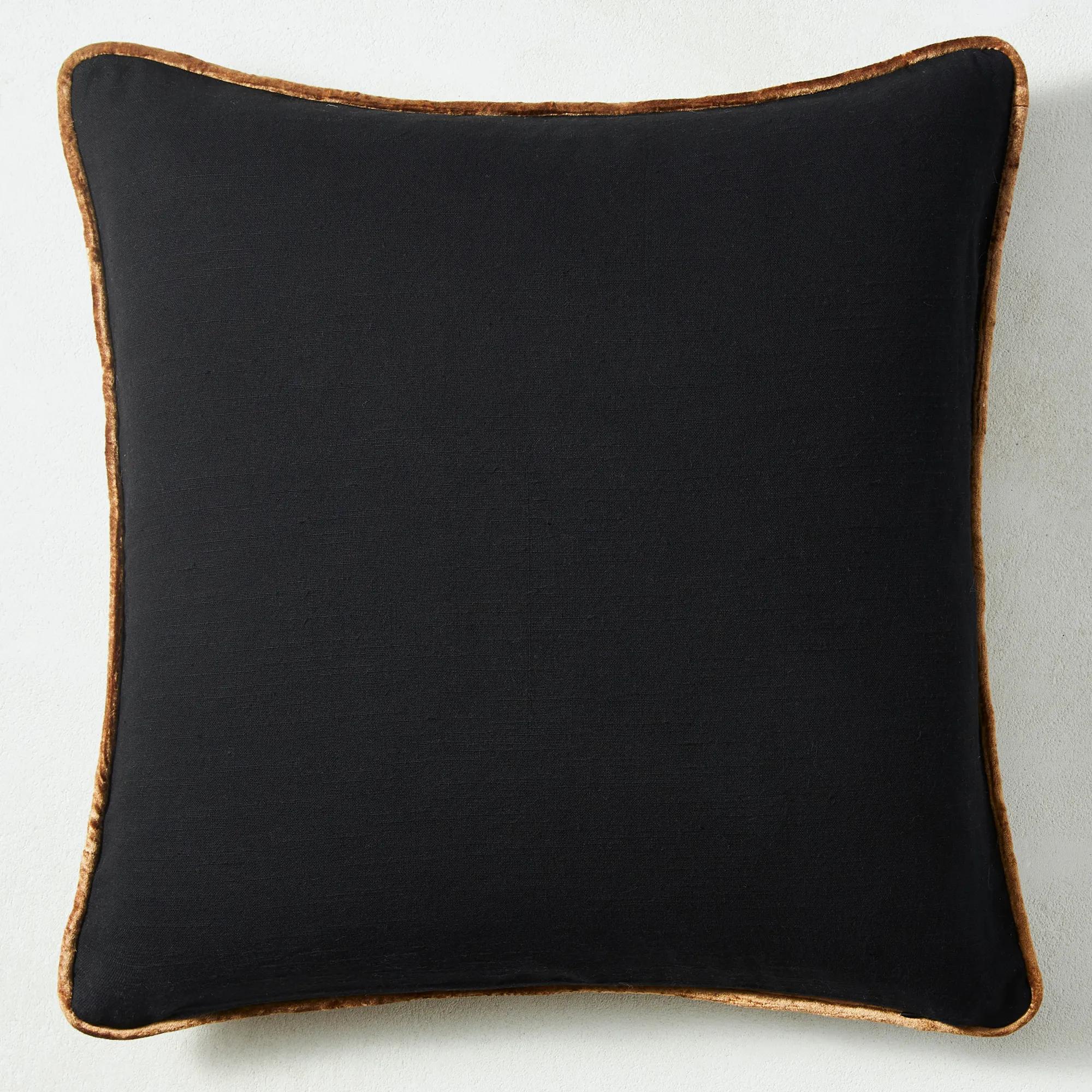 Eliza Pillow 20" - Black/Gold$99A black velvet pillow with gold piping, tiger-stripe sequins, and bead embellishments for striking texture.
