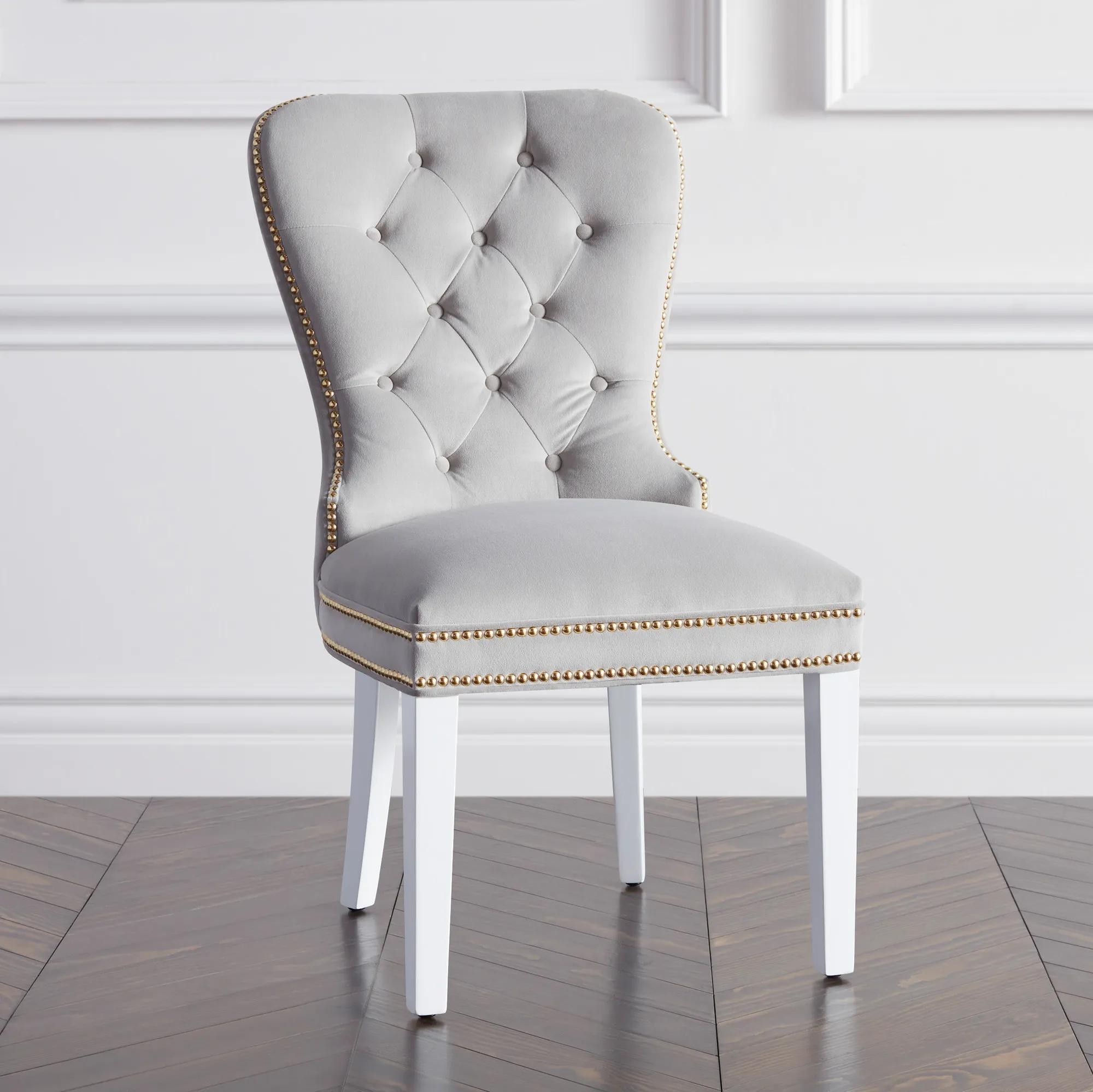 Charlotte Dining Chair - High Gloss White$799A sophisticated dining chair featuring plush velvet upholstery, hand-applied nailheads, and high gloss white birch legs.