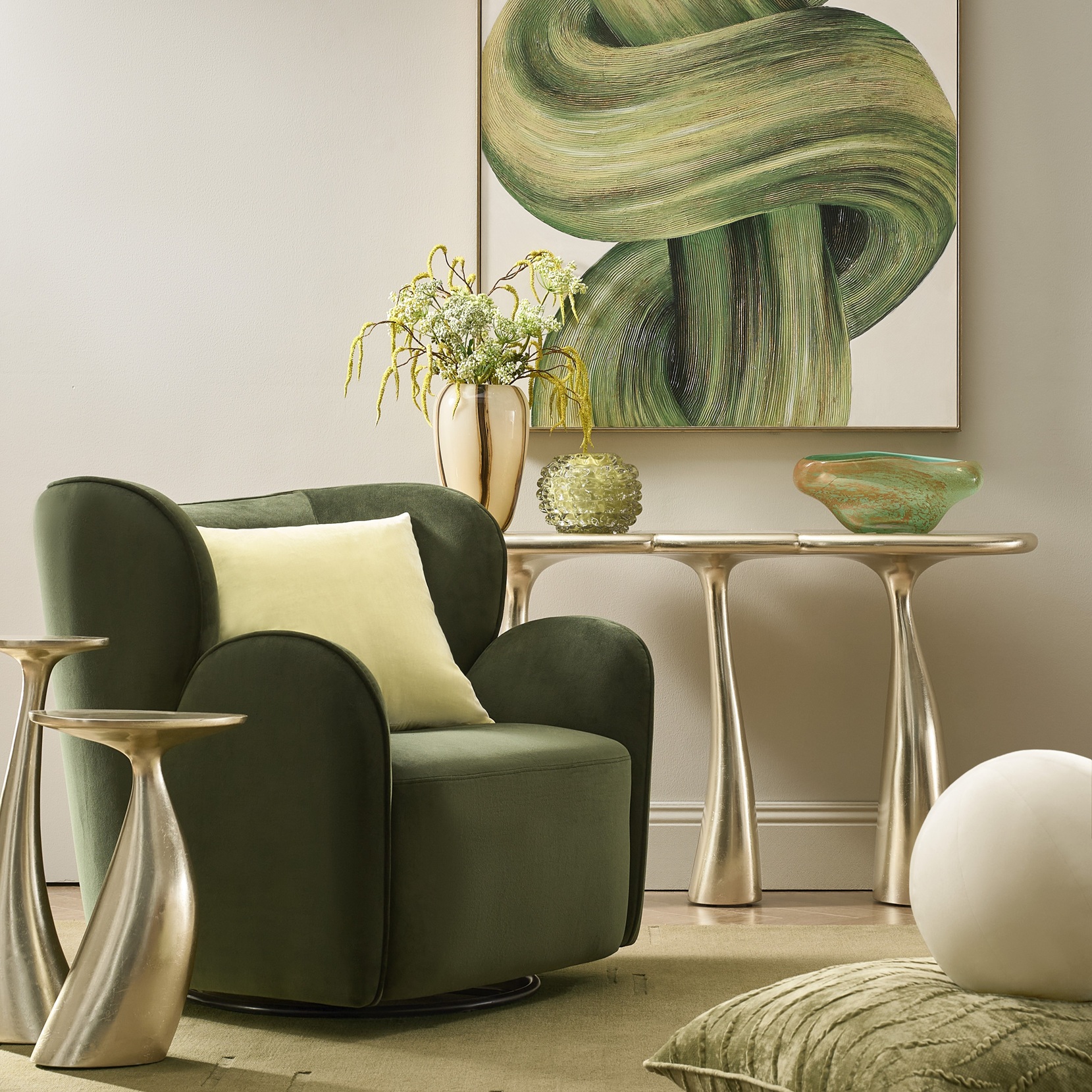 NewNew Ceres Velvet Accent Chair - Jade Green$699A plush jade green velvet chair with a curved silhouette, 360° swivel, and supportive foam cushioning.