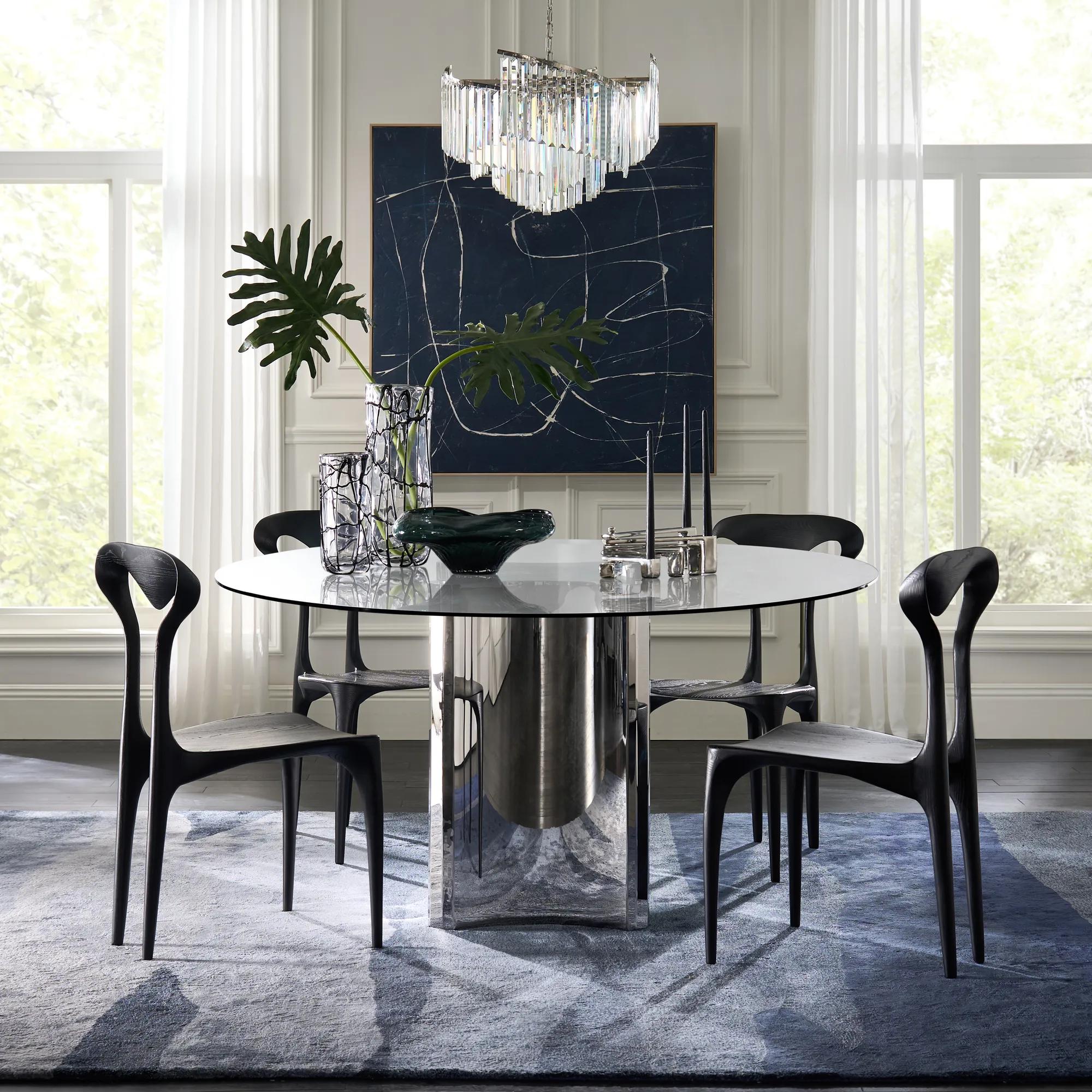 Ventane Dining Table$2999A round tan travertine marble table with a polished stainless steel base for modern, elegant dining spaces.