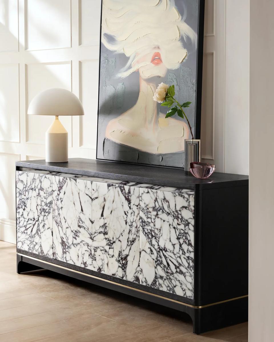 NewNew Vanta Sideboard$1599A matte black oak sideboard with gold stainless steel trim and concealed pulls for modern, elegant storage.