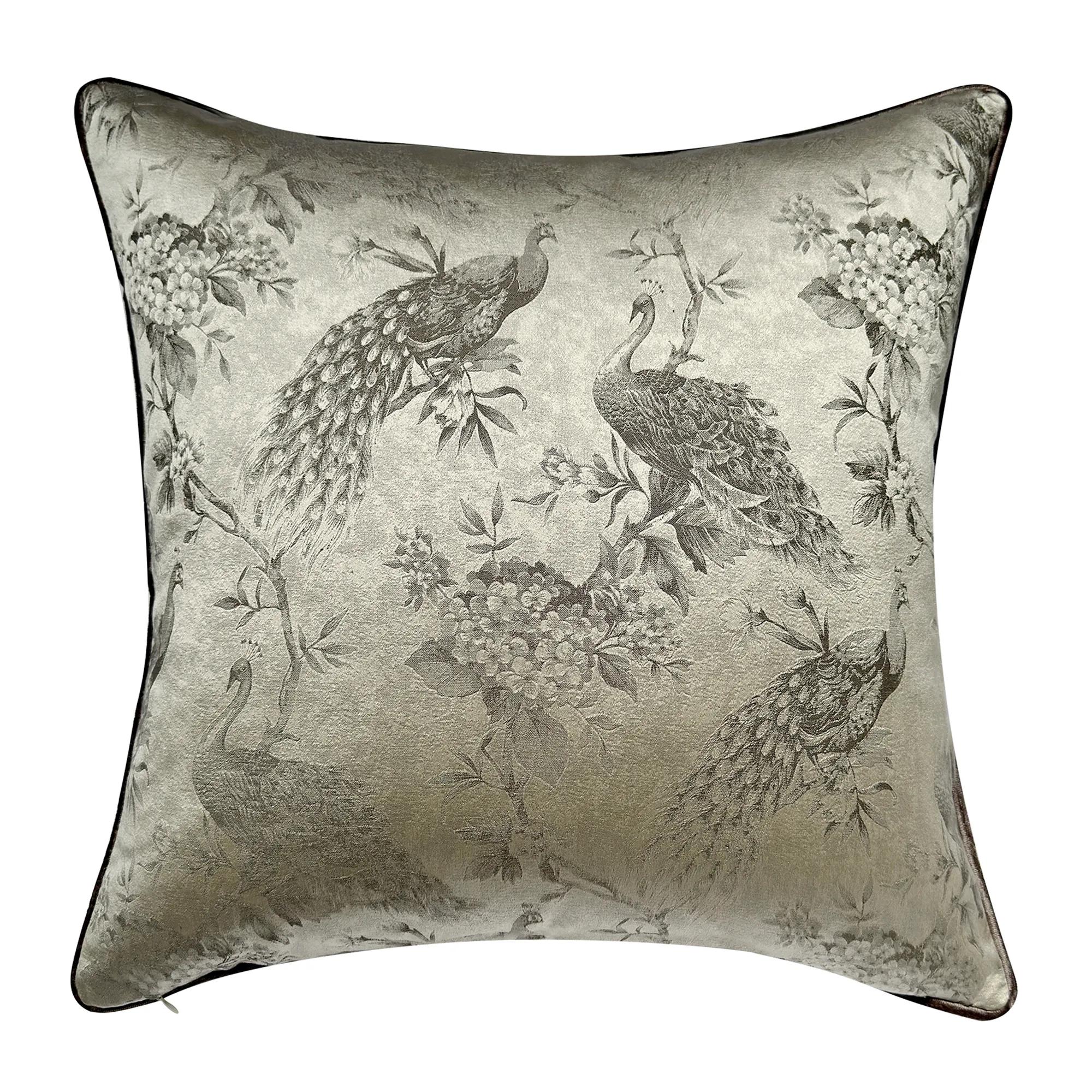 Peacock Pillow 20" - Silver$99A silver jacquard pillow featuring an antique peacock pattern, plush feather down insert, and removable cover.
