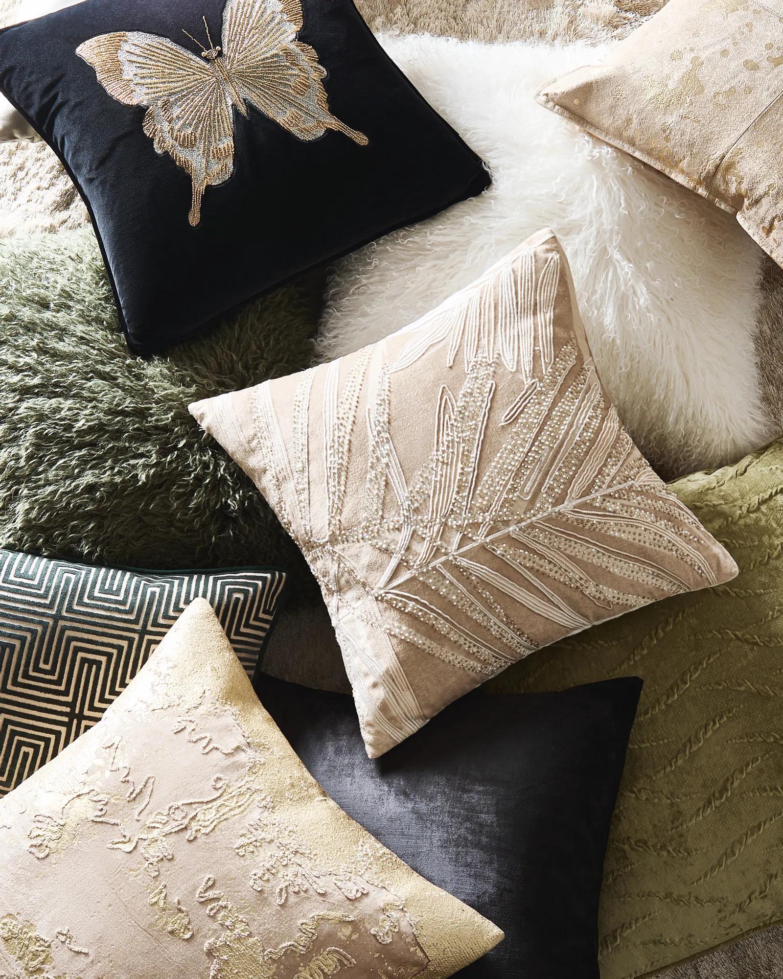 Butterfly Pillow 22"- Black/Ivory$119A sumptuous black and ivory polyester velvet pillow featuring a bold butterfly print and plush feather insert.