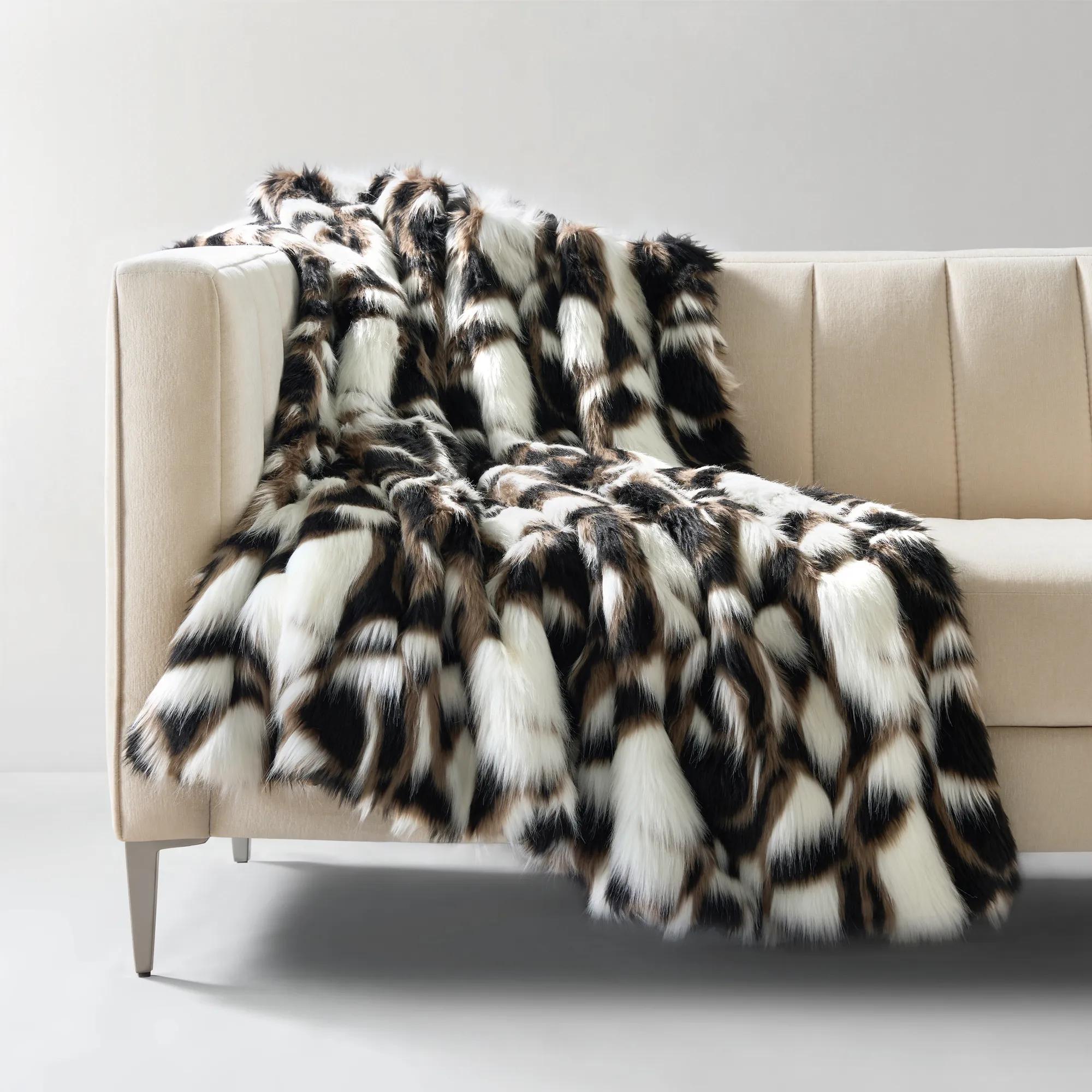 Neve Throw 50" x 60"$89A luxuriously soft faux fur throw featuring a spotted black, brown, and white design with velvet backing.