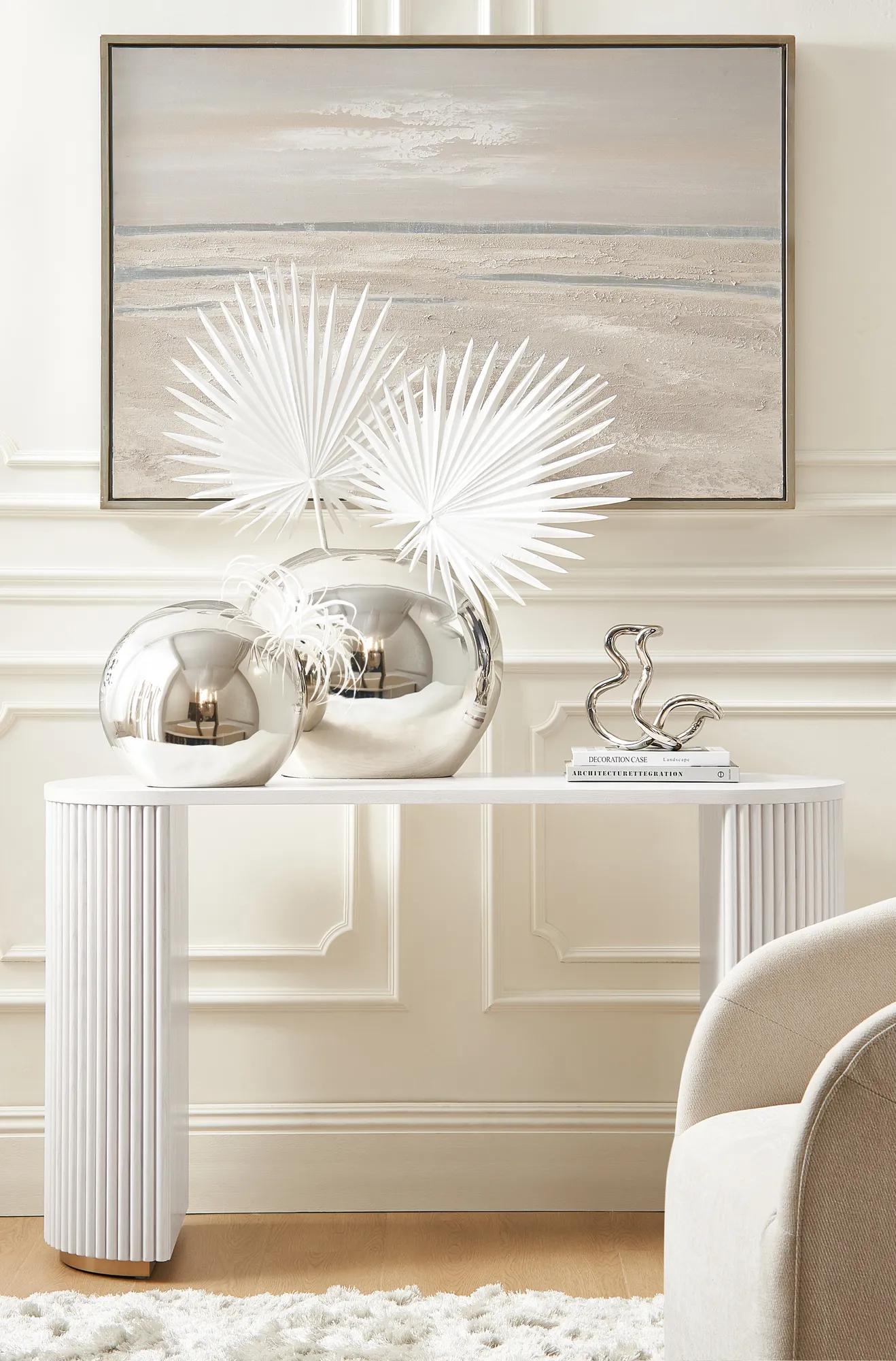 Pairing wall art with a console table, such as a z gallerie sequoia console table used for its organic texture, allows you to create a layered vignette. Enhance the display with sculptural objects, elegant vases, or a statement lamp to complement the artwork. Consider mixing materials and heights to add visual interest, and use the wall art as a focal point to anchor the entire arrangement.