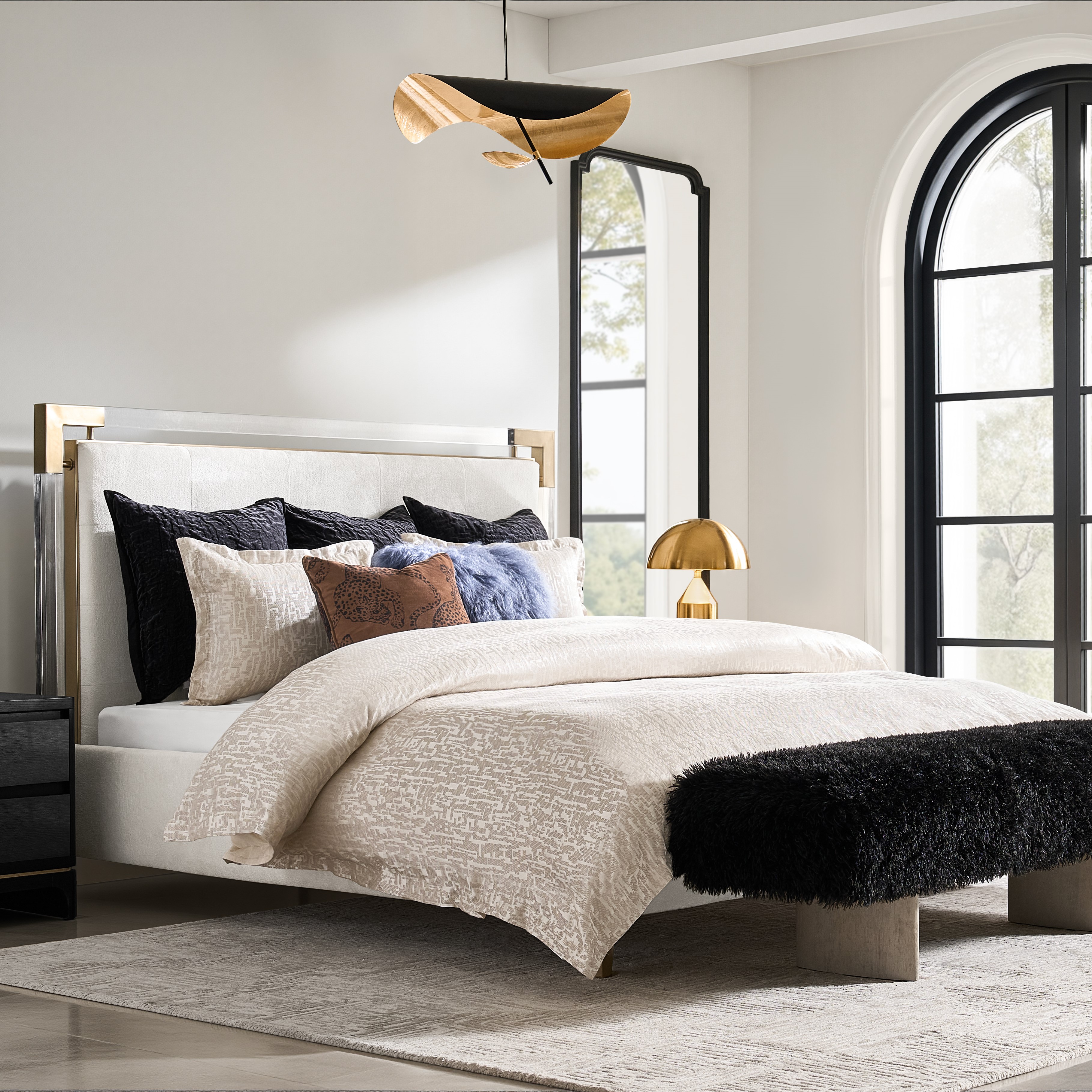 NewNew Vitrina Bed$2799An ivory velvet upholstered bed featuring grid-tufted details, acrylic accents, and champagne-finished stainless steel trim.