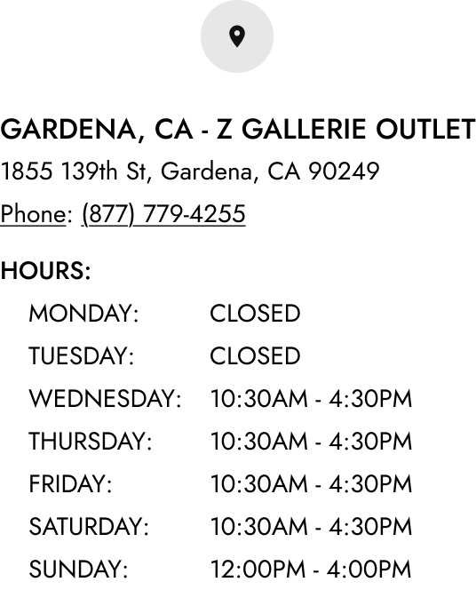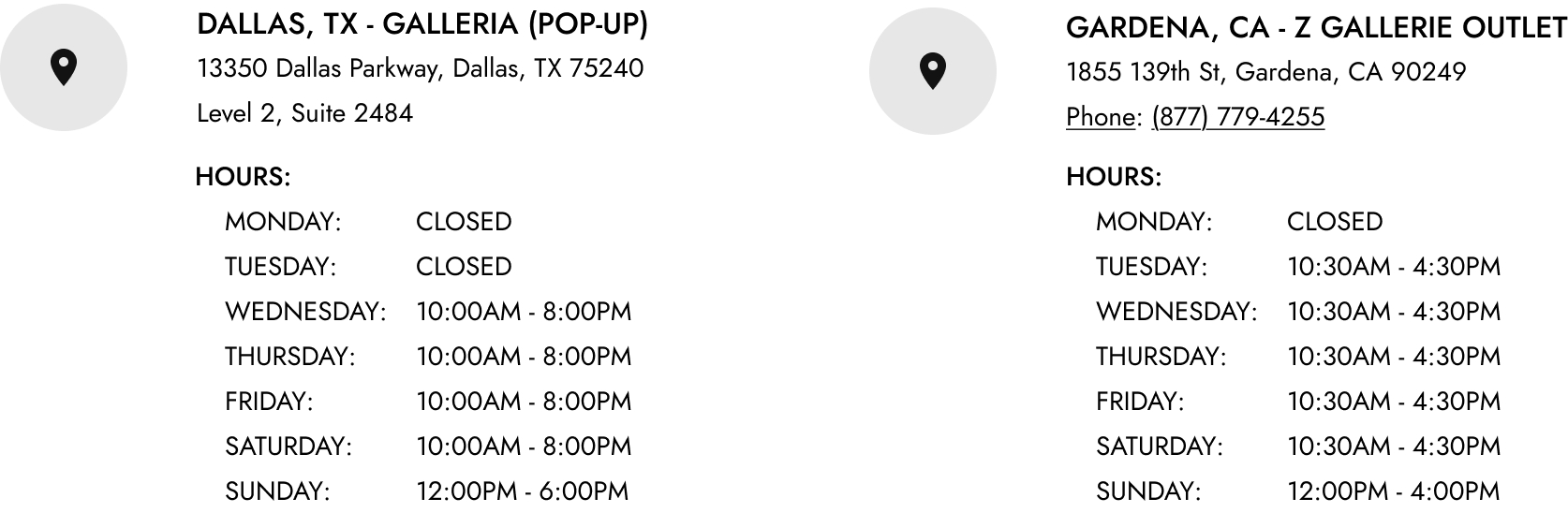 Z Gallerie is committed to bringing iconic style back to more cities soon. As we continue to reopen stores and launch new retail concepts, our goal is to make it easier than ever for you to experience Z Gallerie’s glamorous, design-forward collections in person. Stay tuned for announcements about future locations.