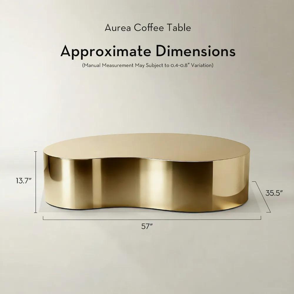 Crafted from premium stainless steel with a polished soft-gold finish, the Aurea Gold Coffee Table is a collection defined by fluid, biomorphic silhouettes and a continuous, mirror-like sheen. Available in three sizes,an expansive 57" statement piece, a versatile 37.5" centerpiece, and a more compact 32" profile,each form is softly rounded and low to the ground, offering generous surface space while keeping the room feeling light and visually fluid.