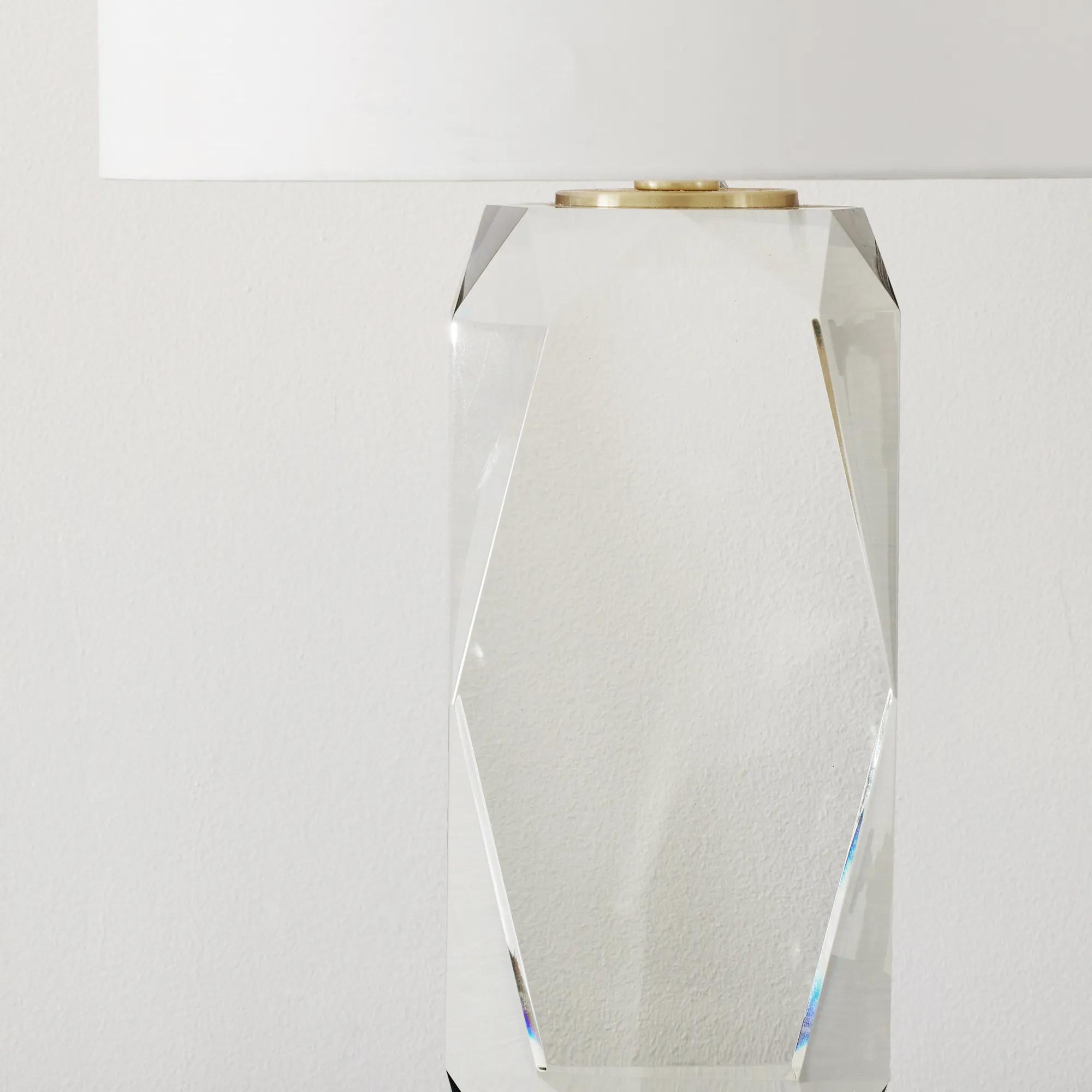 Classic and refined, this table lamp is crafted of clear crystal with subtle facets that beautifully reflect the light. A white drum shade accented with soft brass hardware to complete the look.