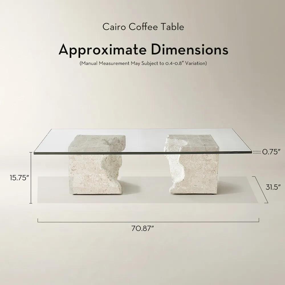 Natural pores, tonal shifts, and fractured contours give each stone block the character of a gallery piece, so no two tables are exactly alike. The low, expansive profile reads as a stone coffee table that invites layered books, trays, and objets without feeling heavy, while the transparent surface keeps sightlines clean. Styled with tailored seating, textured neutrals, and metallic accents, Cairo becomes the quiet centerpiece of luxury living room furniture,equal parts raw materiality and refined modern coffee table design.