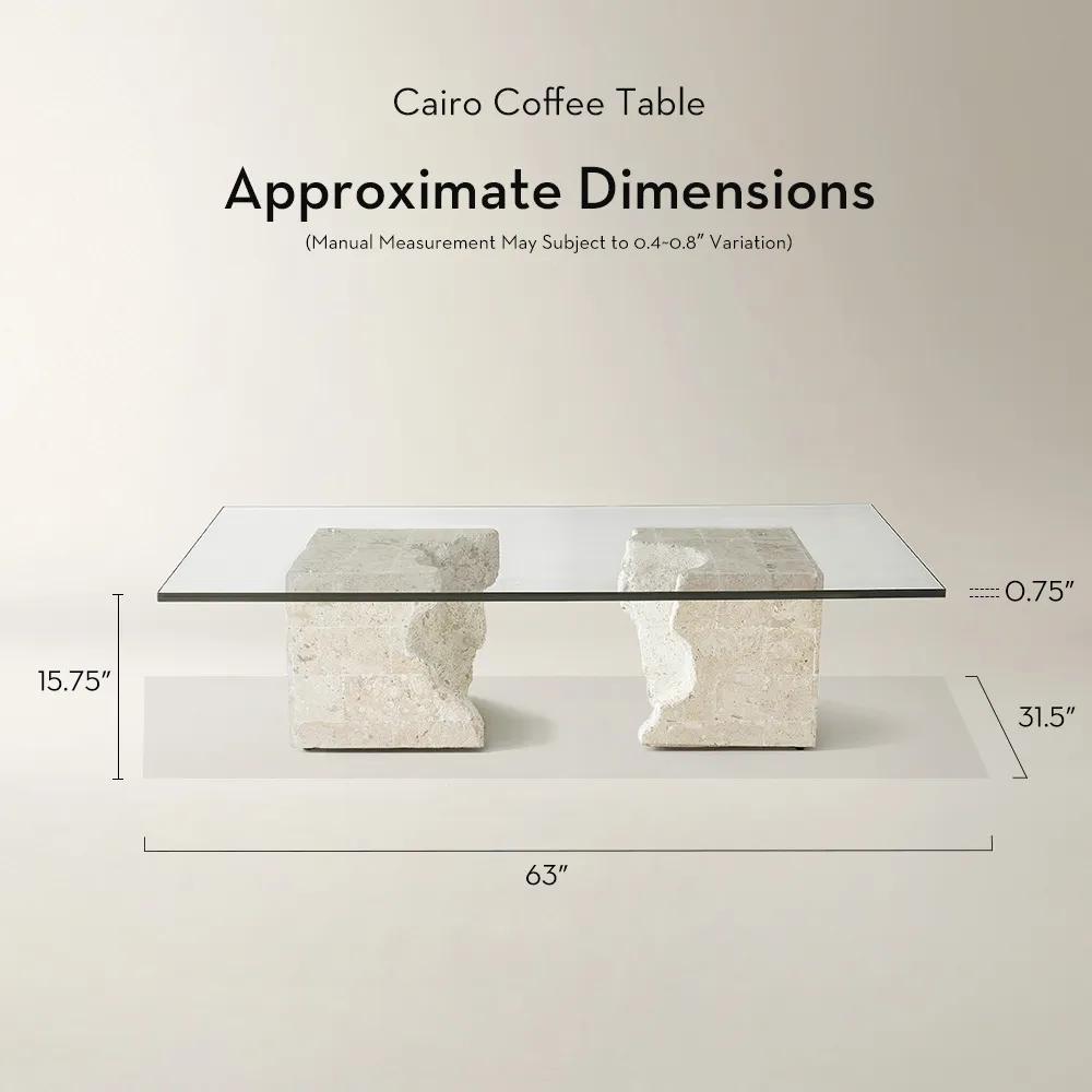 Handcrafted in the Philippines, the Cairo Mactan Stone Coffee Table is a glass coffee table that balances clear tempered glass over hand-carved Mactan stone bases, elevated by chiseled edges and natural variation. Available in two lengths, its thick top appears to float above split stone plinths, preserving an airy, open feel while grounding the room with sculptural, architectural presence.