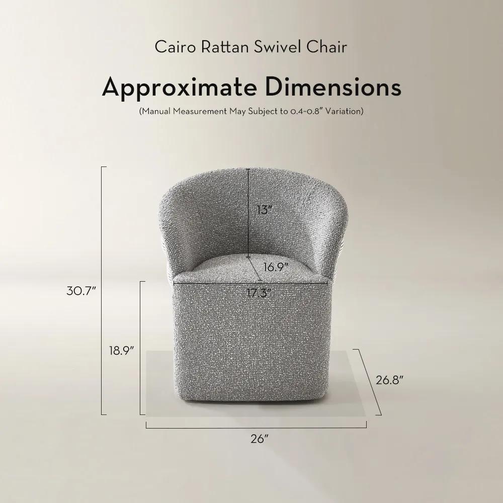 Offered in two refined palettes, Cairo shifts effortlessly from room to room. In Ivory, the woven rattan and creamy chenille read light and airy, perfect as a living room accent chair in bright lounging zones, conversation corners, or at a vanity. In Grey, heathered chenille softens the rattan’s linear texture with a moodier, more architectural edge,an elevated accent chair for bedroom corners or a modern accent chair pulled up to a small bistro or side table. Across both colorways, the barrel back gently cocoons the body, and the smooth swivel motion adds a resort-level ease to everyday moments.